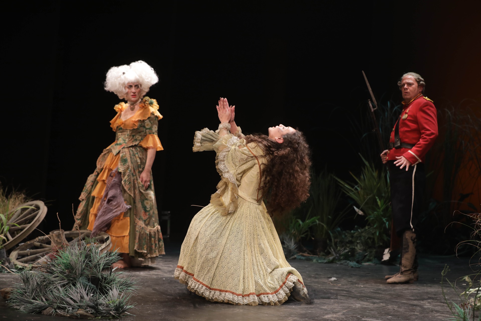 Llanura bonaerense, 1792. Arde el teatro de la Ranchería — primer teatro formal argentino, inaugurado el 30 de noviembre de 1783- y las llamas iluminan la noche virreinal. En su espantada huida, dos grotescas damas en apuro pierden el rumbo: huyen del incendio de la ranchería, entre pajonales y alimañas, en una peripecia horrible y sin dirección. Cimarronas extraviadas en un lodazal, dejan atrás a una tercera hermana mestiza, a quien dan por muerta en el siniestro. Caminan solas por una llanura encharcada, añorando esa cálida urbanidad europea que les fuera legada por sus padres hispanos. Pero la impostura declina: toda tragedia esconde una traición y la verdad les pisa los talones.