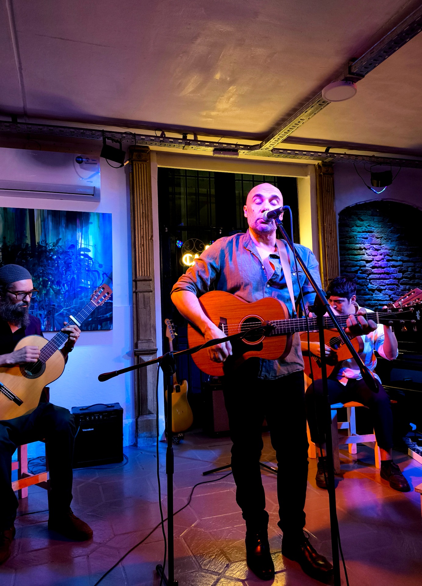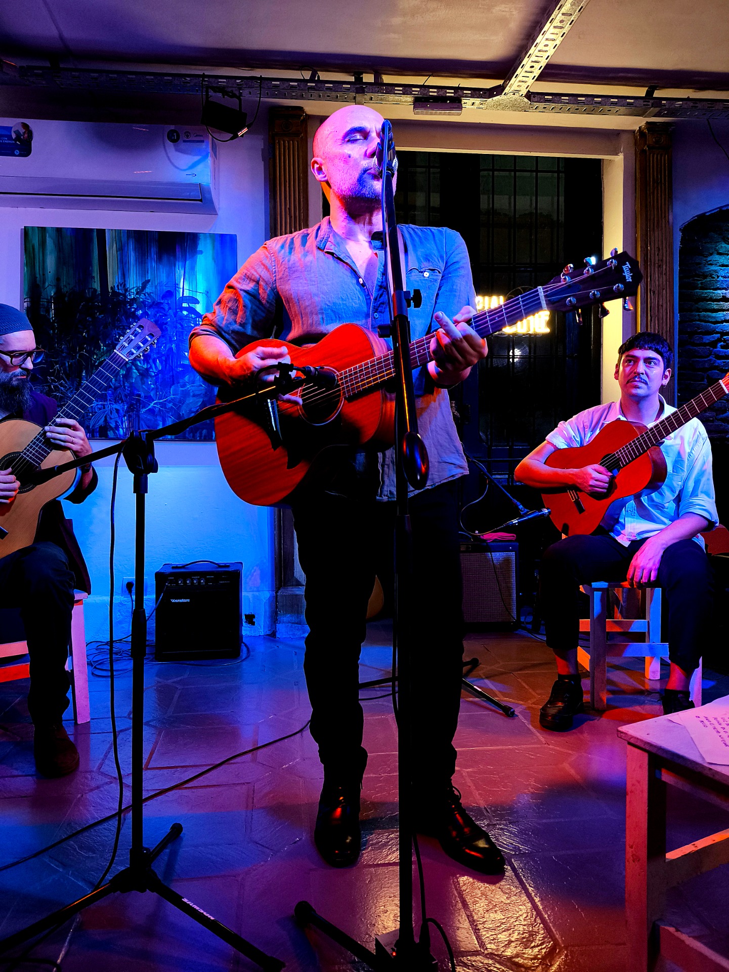 San Telmo favorece especialmente un encuentro musical rioplatense sustentada en la guitarra criolla porque condensa memoria y cercanía. Sus calles empedradas, los bares con mesas pequeñas, la acústica natural de los clubes sociales y ese aire de barrio que resiste al paso de los años generan un clima de escucha atenta, casi confidencial. Es un territorio donde la canción no necesita imponerse: basta con decirse. El predominante instrumento, en este contexto, suena como idóneo instrumento de relato. Allí, las canciones encuentran un marco ideal para desplegarse sin apuro, en contacto directo con el público, como si cada acorde fuera parte de una conversación compartida. Esta es la belleza que Presa y su talentoso trío vinieron a ofrecernos generosamente.