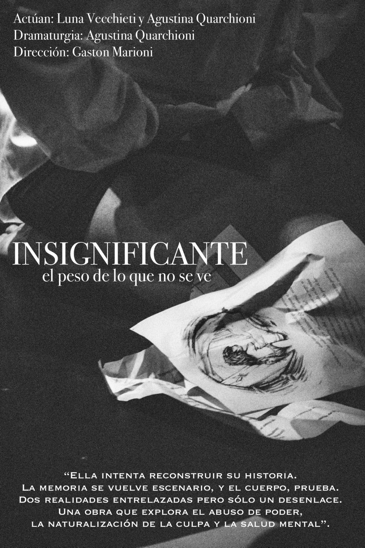"Insignificante: el peso de lo que no se ve" se configura como una historia ficcional y, a la vez, un válido, valiente y necesario homenaje a una víctima de femicidio. Desde dicho punto de partida, despliega un contundente relato dramático cuyo desarrollo encuentra un correlato visual preciso: papeles desparramados y dispersos sobre el piso se convierten en visible huella de un desorden de memoria en caótico intento por encontrar su cauce.