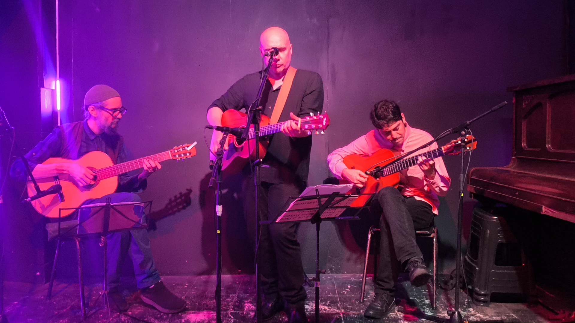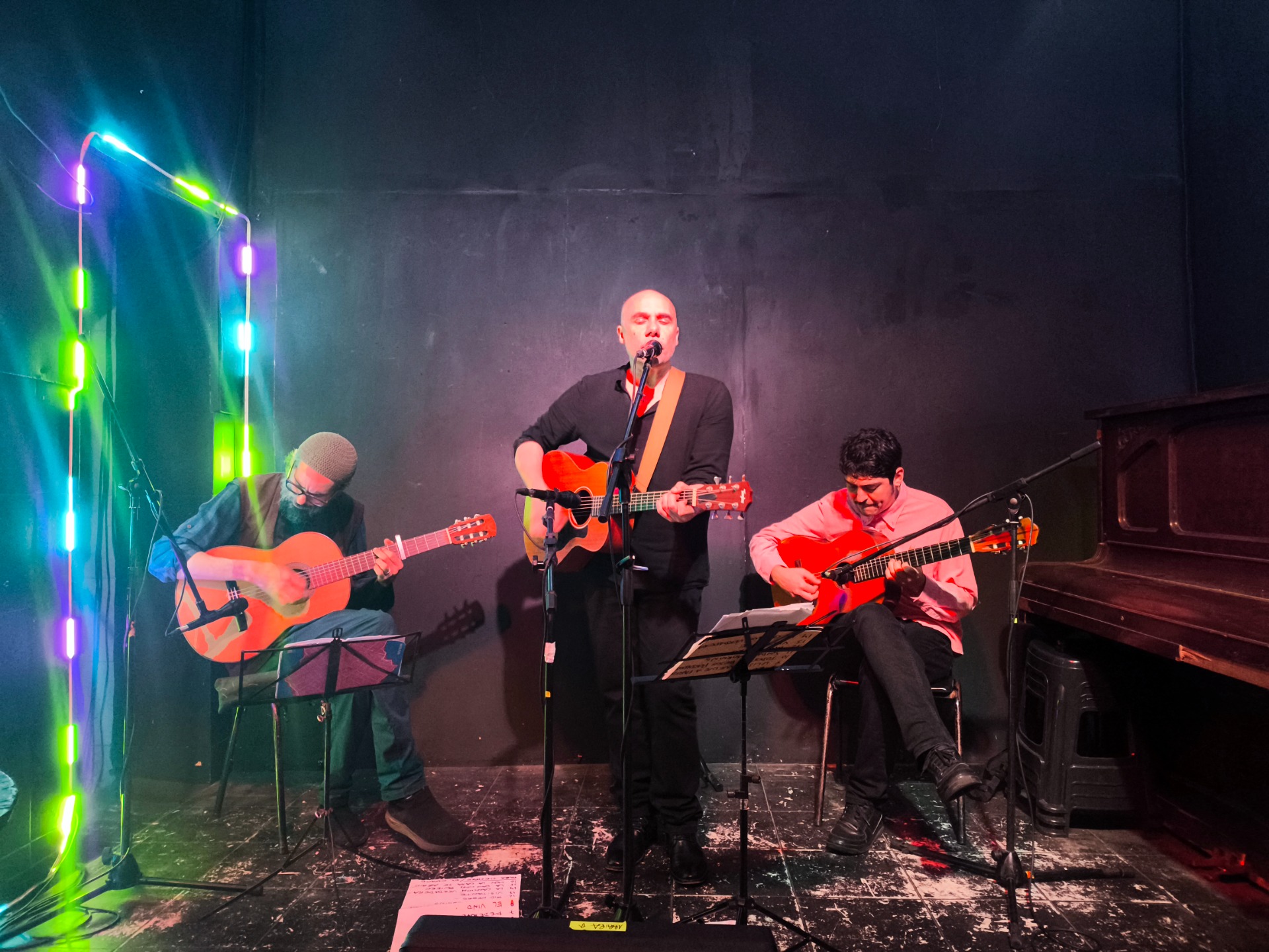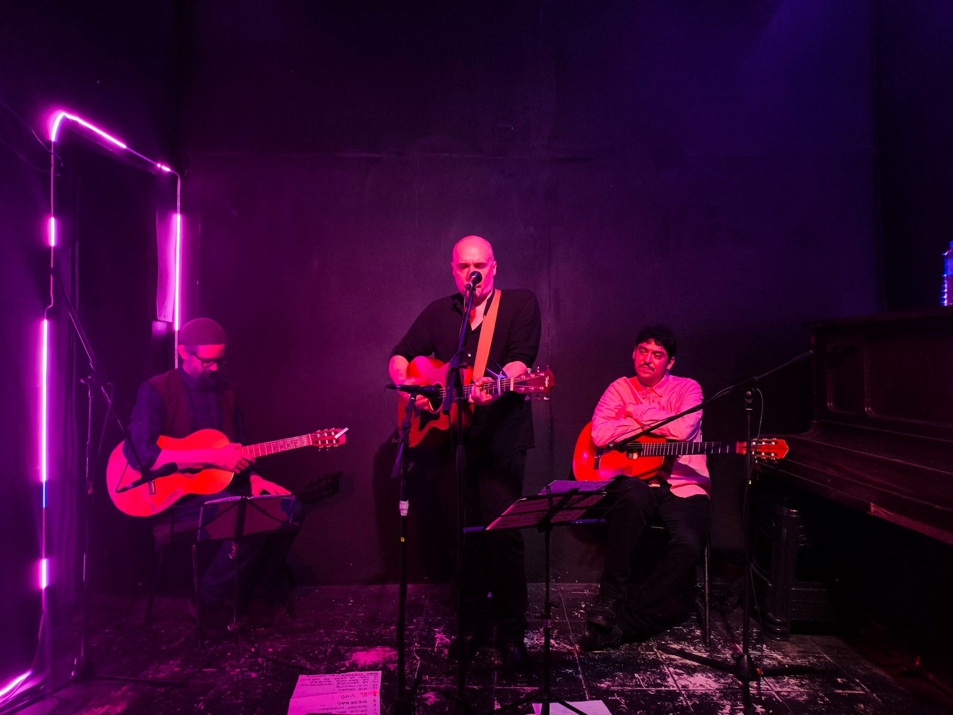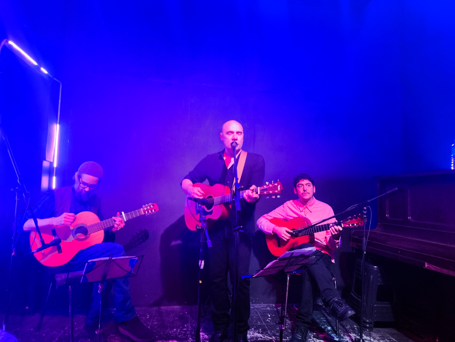 En su más reciente propuesta, trajo consigo a la intimidad y cercanía que ofrece Galpón B novísimas composiciones ("El Espacio" fue la encargada de inaugurar el repertorio), acompañado por las violas criollas de Nahuel Roht y Juan Ravioli. Durante una cálida noche y a lo largo de un show que se extiende por una hora y cuarto de duración, el grupo ofreció una sonoridad cálida y homogénea, de gran riqueza tímbrica y rítmica. La distribución de roles —una guitarra en la base armónica y otras dos en líneas melódicas— permitió generar diálogos, densidades variables y un entramado de texturas complementarias que fueron desde la sutileza de un acorde hasta la fuerza de un rasgueo compartido, funcionando como una pequeña orquesta acústica en miniatura.